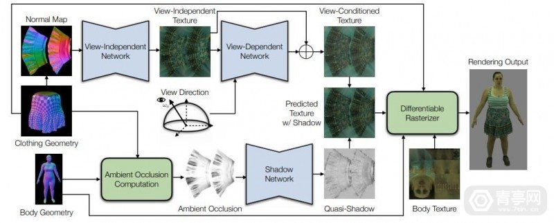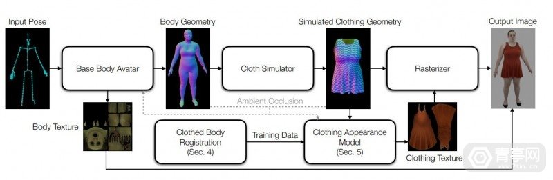 据了解,高保真建模通常需要采用物理渲染方式,但是在交互式应用中动态渲染的成本又相当昂贵。而数据驱动的深度外观模型生成方案也存在局限。因此,科研人员引入了一种由全身姿态驱动的显式服装建模,并从真实数据中学习到逼真的动态服装外观变化。简单来讲,就是在显式几何结构上运行神经服装外观模型,即在训练时使用高保真追踪数据,而在渲染动画时则结合物理模拟方案。